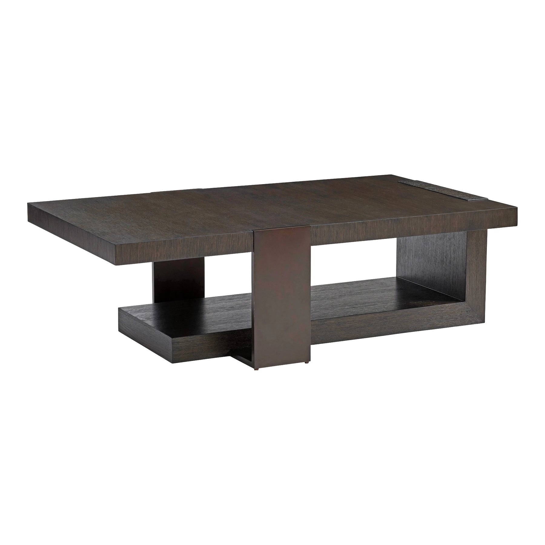 The rectangular cocktail table features a cantilevered top over a wooden base, with decorative metal supports in a burnished bronze finish that bridge the two. The interesting asymmetrical design makes a great contemporary statement within mountain modern styling.