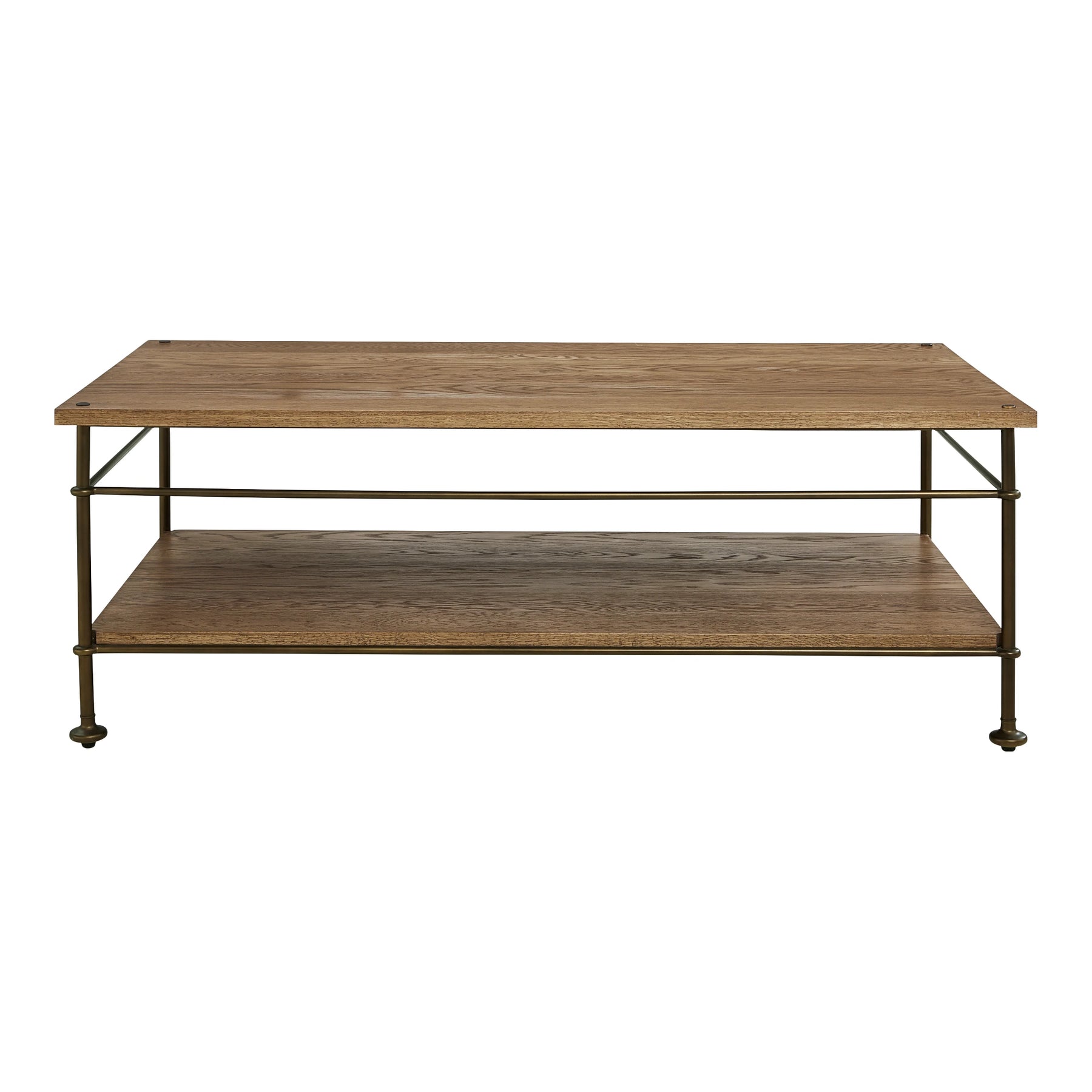 Round metal legs are combined with solid oak to create the St. Lawrence Metal Cocktail Table. Its legs emerge through the surface of the broad rectangular oak top and are joined below with horizontal metal stretchers. A solid oak fixed shelf is the final ingredient, adding storage space and yet another beautifully grained expanse.- Oak