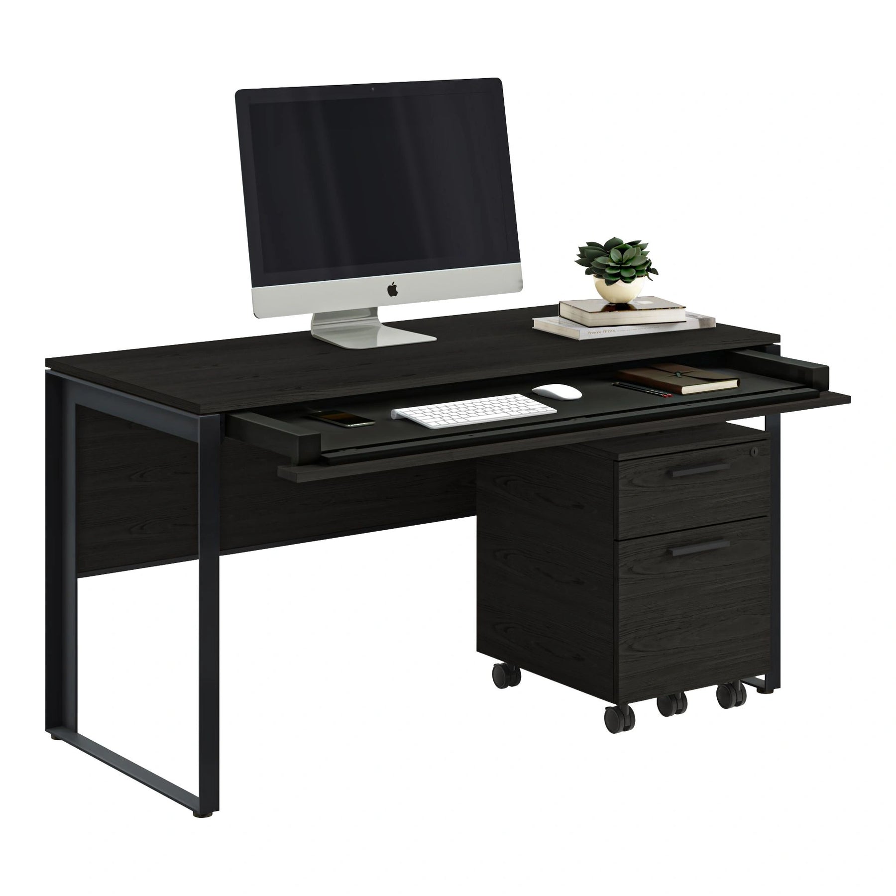 A generous work surface comfortably accommodates monitors, laptops, and paperwork, with space left over for lighting and personal objects.