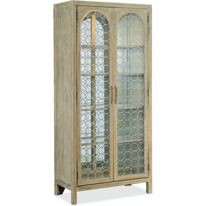 - Material: pecan veneers, puck light, metal, tempered glass, antique mirror, rope