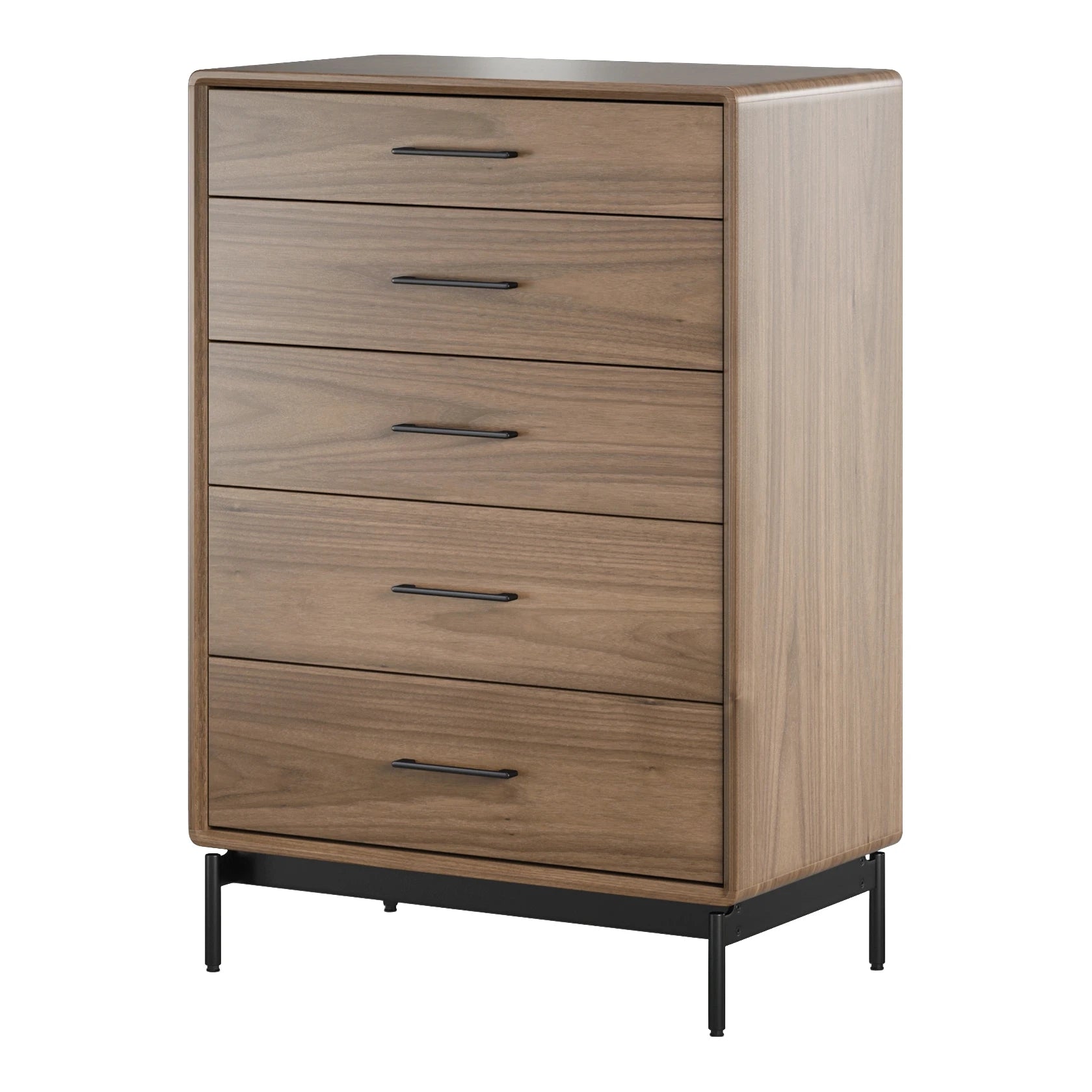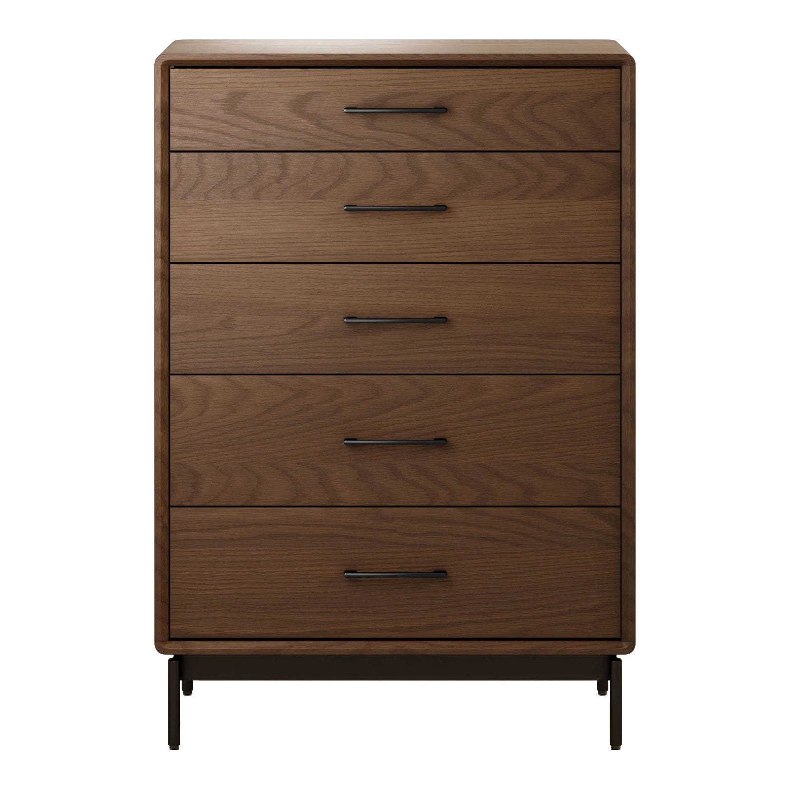 The 9185 5-Drawer Chest introduces a soft, modern presence that feels right at home in a calm, collected Pacific Northwest retreat. The LINQ 9185 tall 5-drawer modern bedroom wardrobe chest by BDI Furniture features elegant natural wood grains, soft rounded edges, a sturdy metal base, and a proprietary interlock system with roomy self-closing drawers. Crafted with beautiful natural wood grains and smooth, rounded edges, the LINQ chest adds modern elegance to any bedroom. Included wire wraps attach to the back to keep cords controlled.