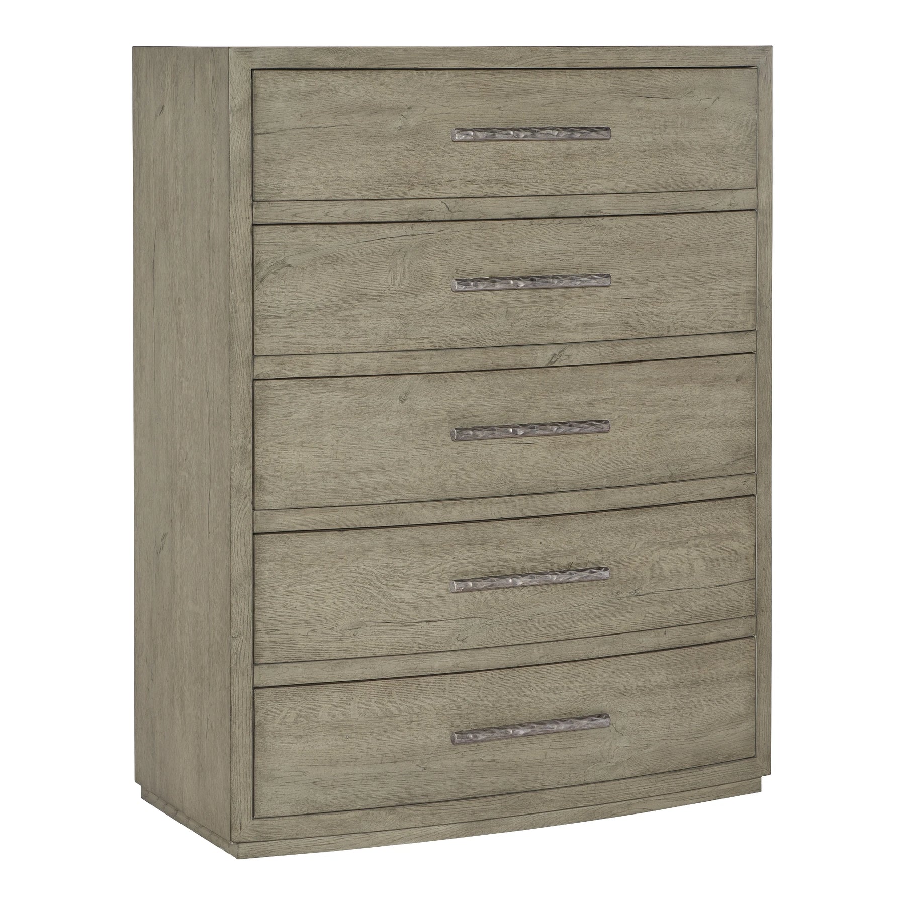 Linville Falls Pisgah Five Drawer Chest brings a confident, design-forward feel to your space. Finished in Mink: A soft smoked gray finish. Textured metal bar pulls in an antique pewter finish., with a look that complements casual interiors.