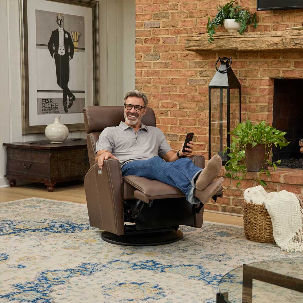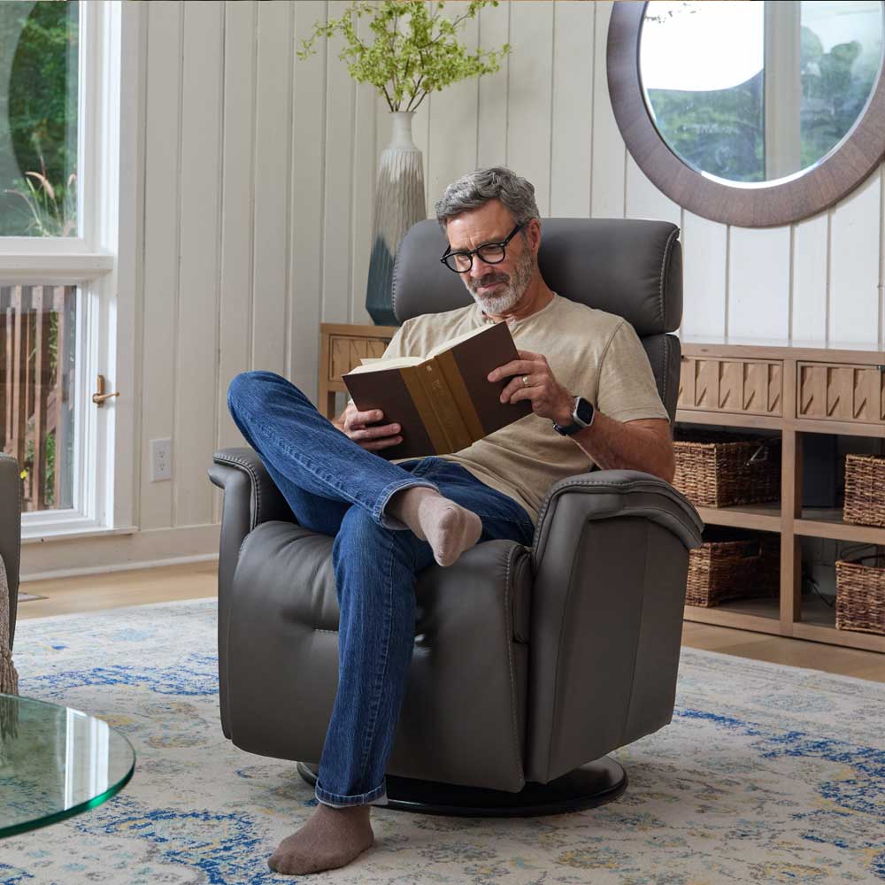 The Fjords Milan Swing Relaxer is designed for ergonomic comfort with a clean, modern profile. It features an adjustable height headrest and motorized articulating headrest support, helping you fine-tune posture for reading or reclining. The swing base adds swivel and gentle rocking motion, and Milan is offered in both motorized and manual versions in two sizes.