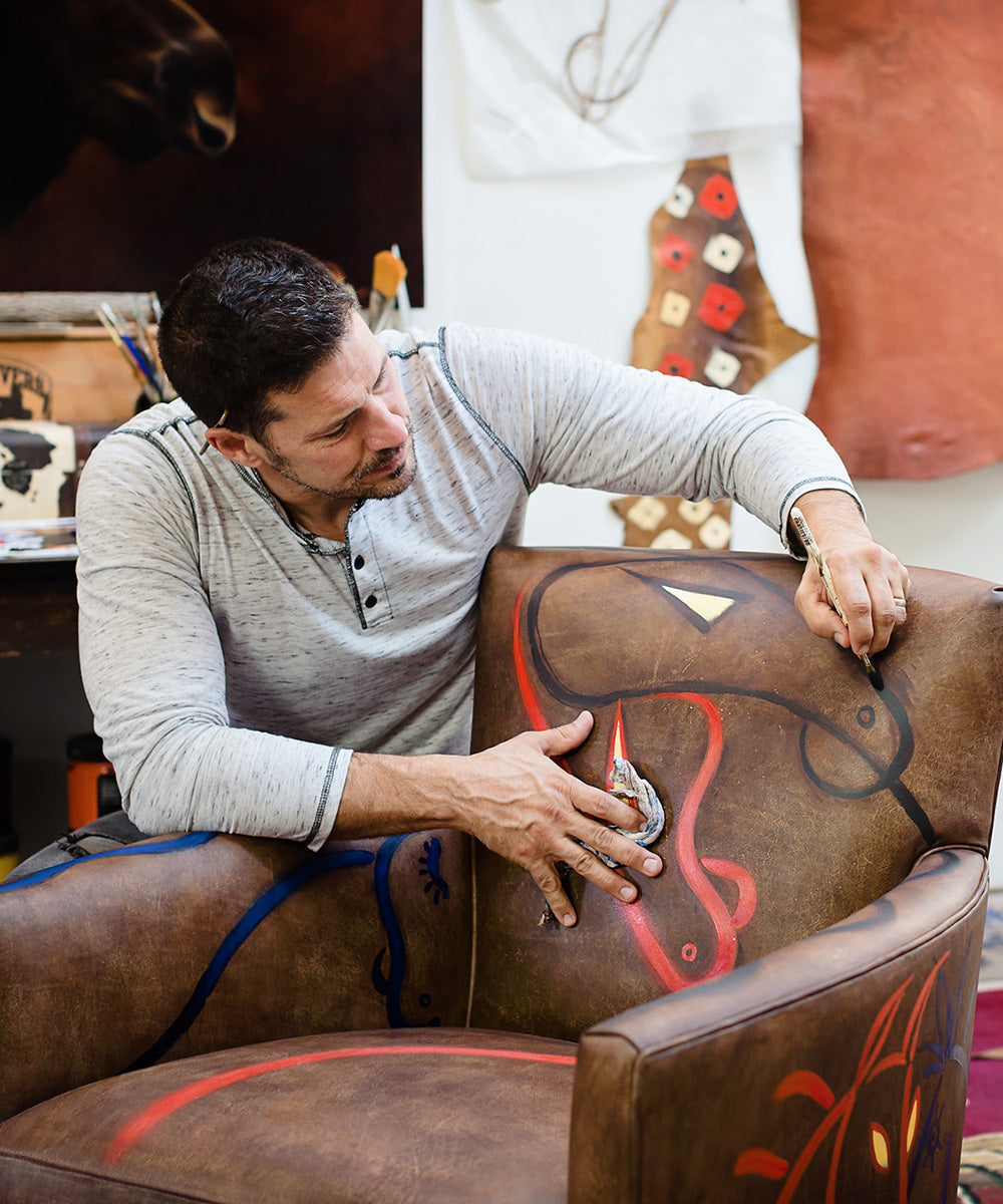 Hancock & Moore's hand painting service adds a truly custom touch to your leather furniture. Their professional artists start by lightly buffing the leather. Then, the artist paints the chosen design by hand. Once the painting is applied, an expert craftsman treats the leather to protect the painting and ensure lasting beauty. Painting can be applied to any furniture surface, be it the front, back, side, arm or even the cushion.