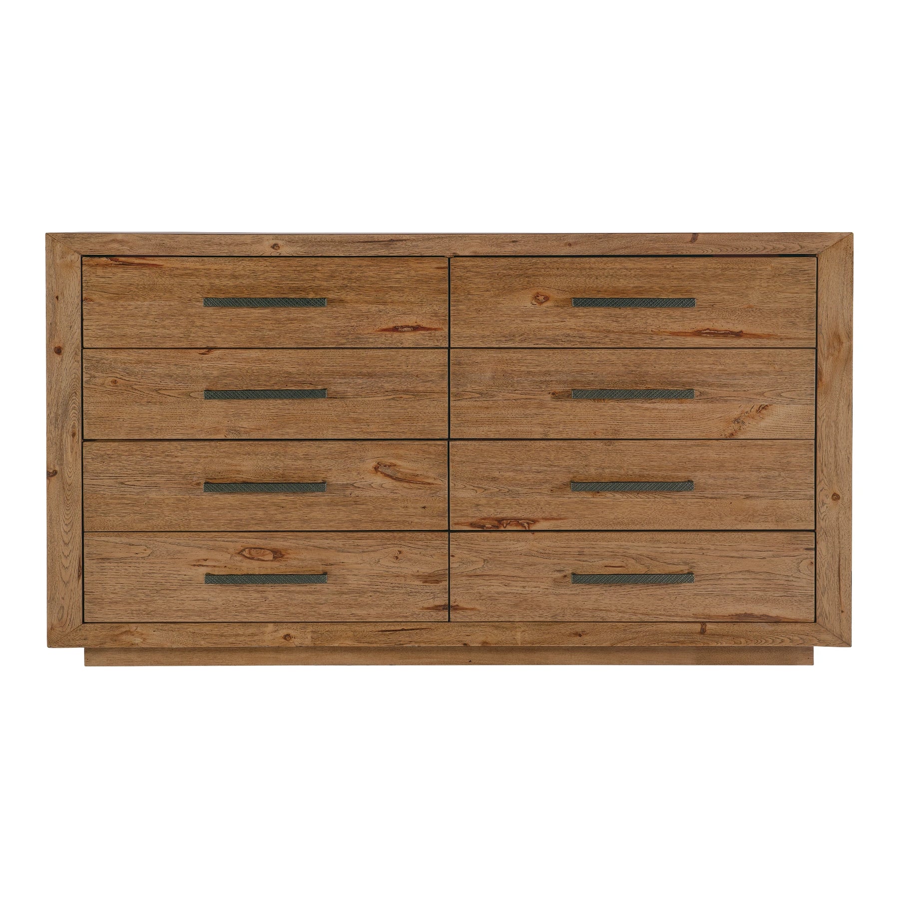 Big Sky Eight Drawer Dresser brings a confident, design-forward feel to your space. Finished in Vintage Natural: a warm, rustic, organic finish over hickory veneers. Distressing includes chopping, rock, drawknife, gauging, chain distressing and wire brush. Dark brushed bronze bar pulls with crosshatch texture., with a look that complements casual interiors.