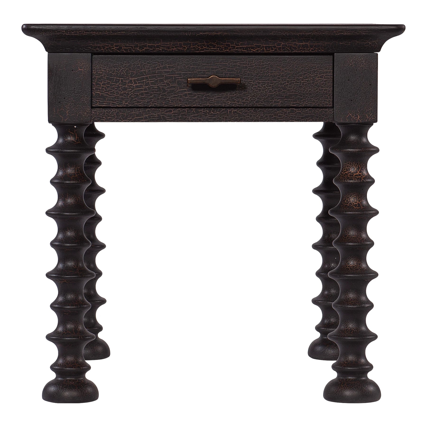 Big Sky Turned Leg End Table brings a confident, design-forward feel to your space. Finished in Charred Timber: inspired by the restorative beauty of a fire-ravaged forest. Distressing includes worm holes, rasping, gauging, plane shock, hand plane, drawknife, wire brush and screw head. Dark brushed bronze metal bar pull., with a look that complements casual interiors.