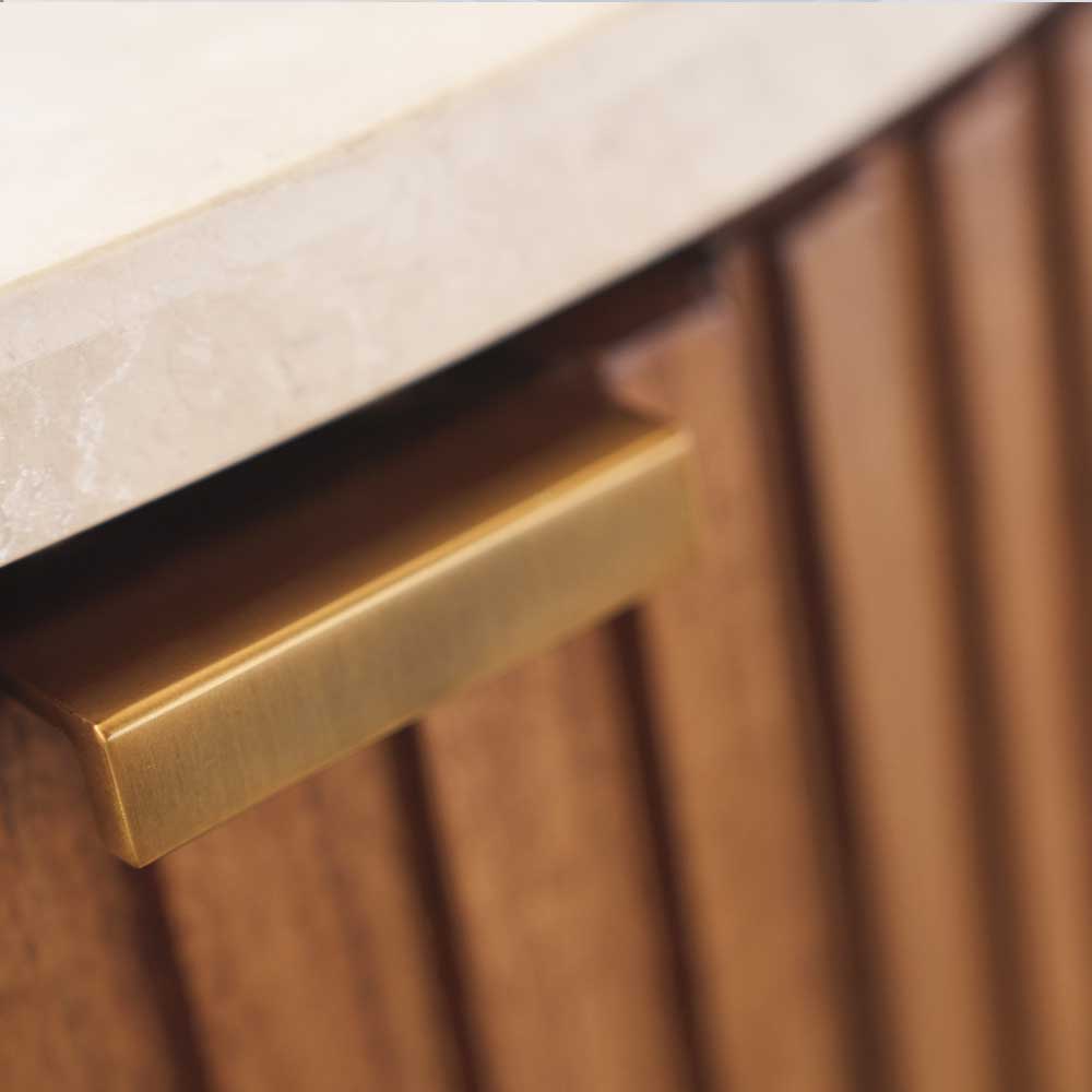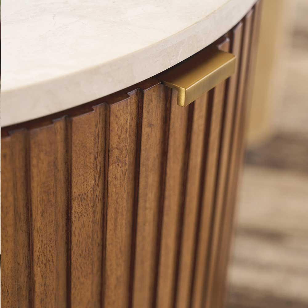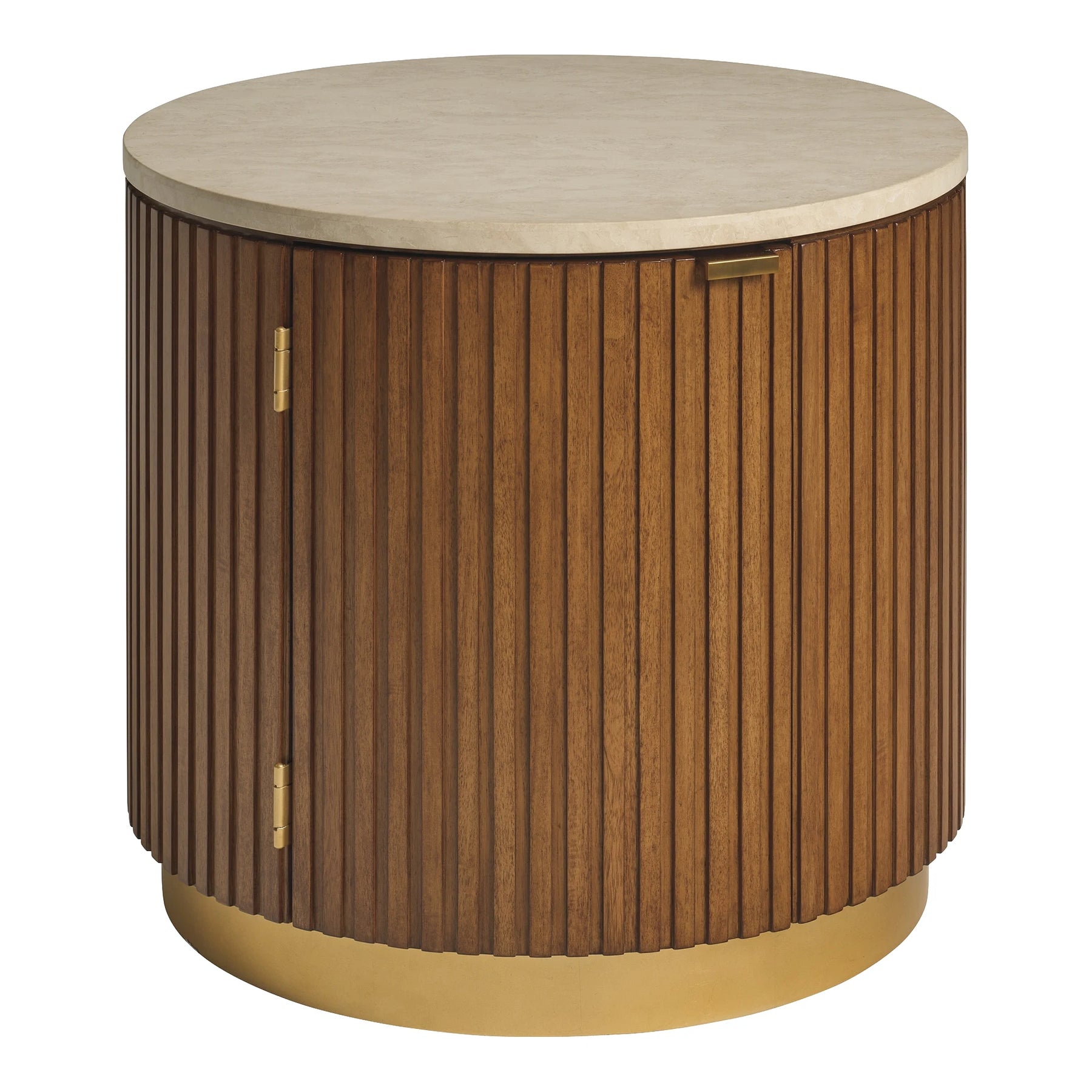 The Avenida end table is designed to pair with the cocktail having the same name. It features fluted detailing around the perimeter, an inset Anticato marble top, a concave stationary shelf behind the door and a recessed metal plinth base finished in satin gold.