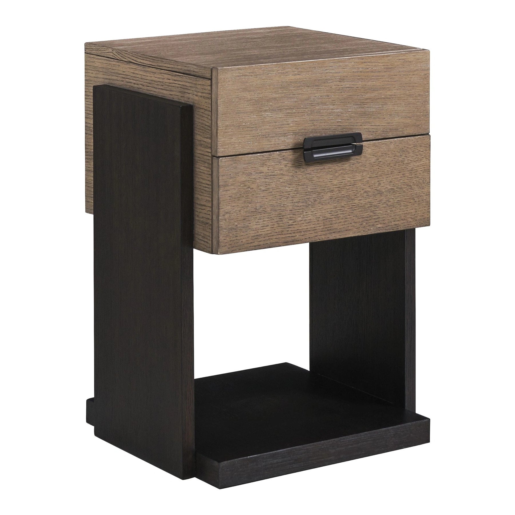 The smalller night table offers a stiking look with two soft-close drawers in the Senegal finish supported by a base and vertical uprights in the Tunis finish. The open compartment on the base and finished back makes this ideal chairside in the bedroom.