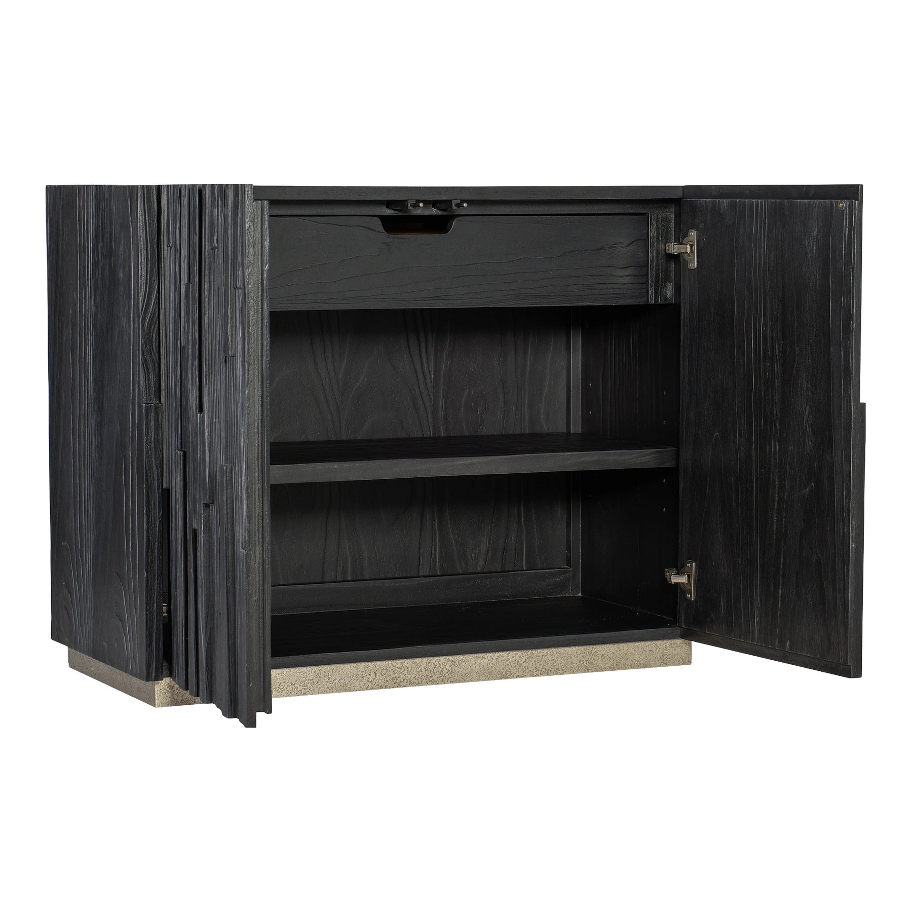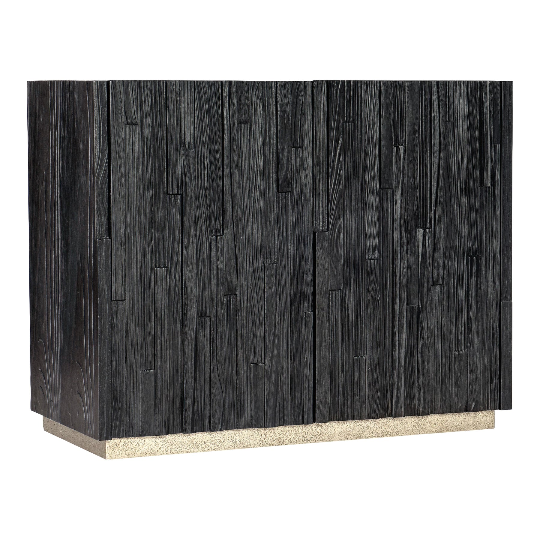 Chapman Shou Sugi Ban Accent Chest brings a confident, design-forward feel to your space. Finished in The Charred Black finish is achieved through Shou Sugi Ban, a Japanese technique that creates a look resembling burnt wood. Accent pewter finish on base to simulate metal. Distressing includes sandblasting, wirebrushing, wormholes, and rock distressing., with a look that complements casual interiors.