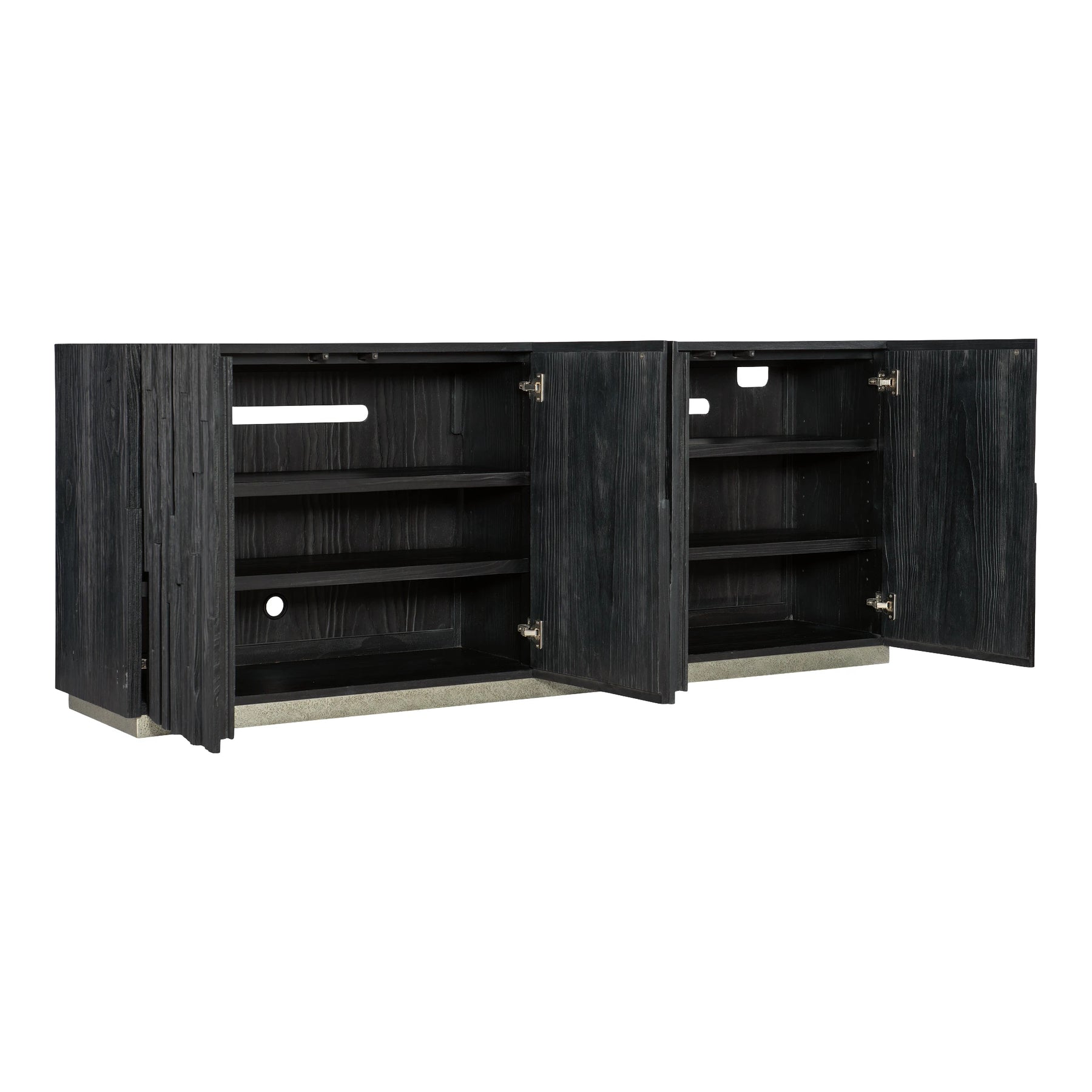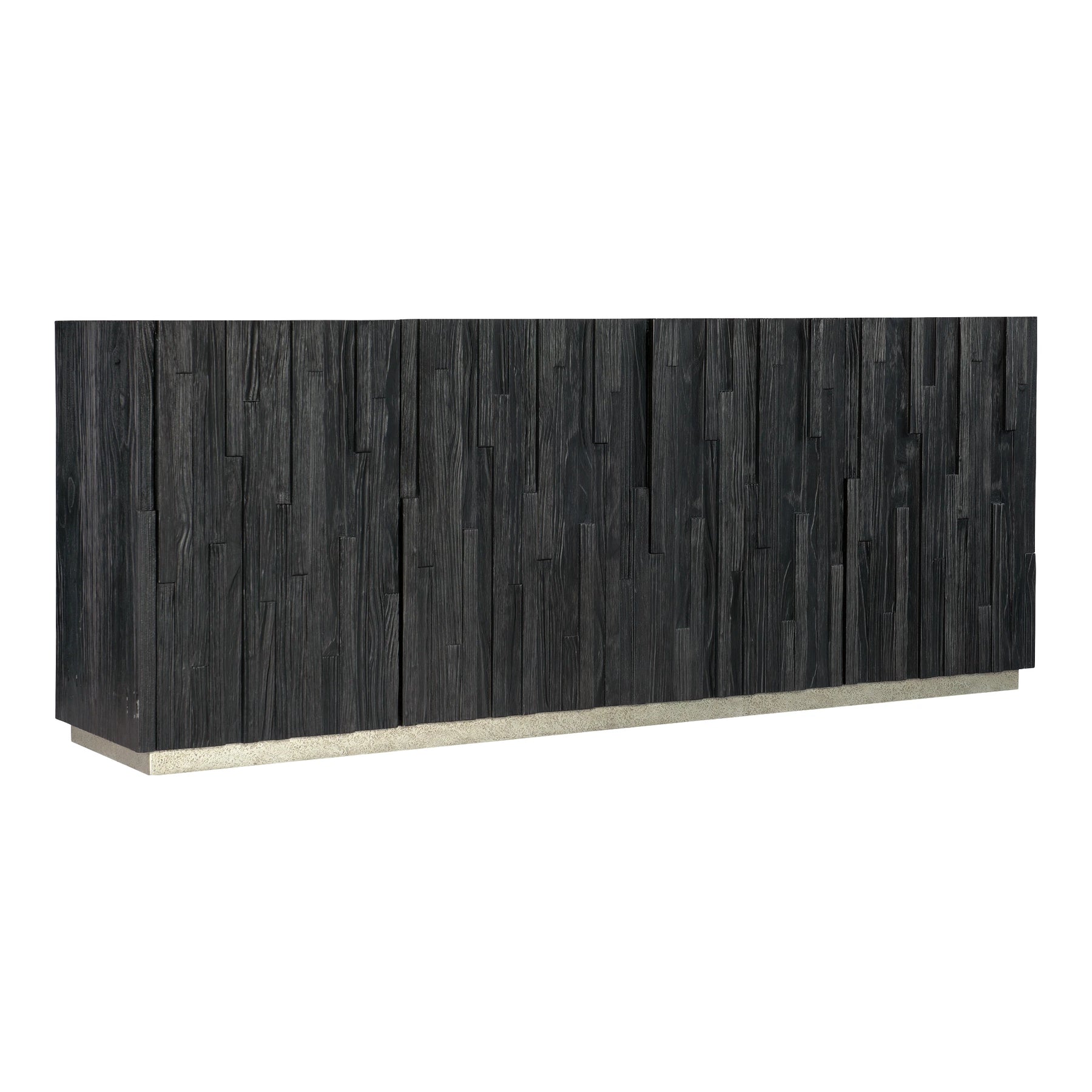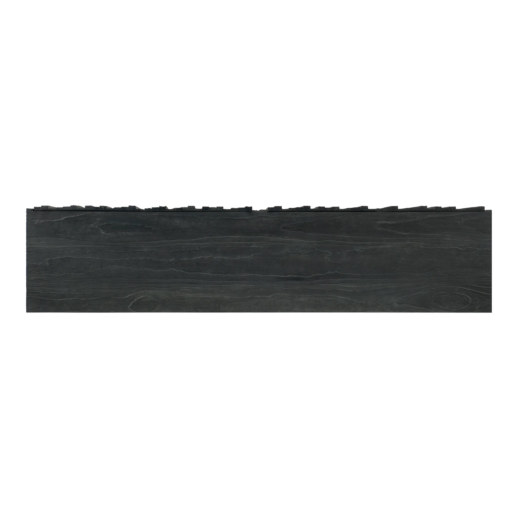 Chapman Shou Sugi Ban Entertainment Console brings a confident, design-forward feel to your space. Finished in The Charred Black finish is achieved through Shou Sugi Ban, a Japanese technique that creates a look resembling burnt wood. Accent pewter finish on base to simulate metal. Distressing includes sandblasting, wirebrushing, wormholes, and rock distressing., with a look that complements casual interiors.
