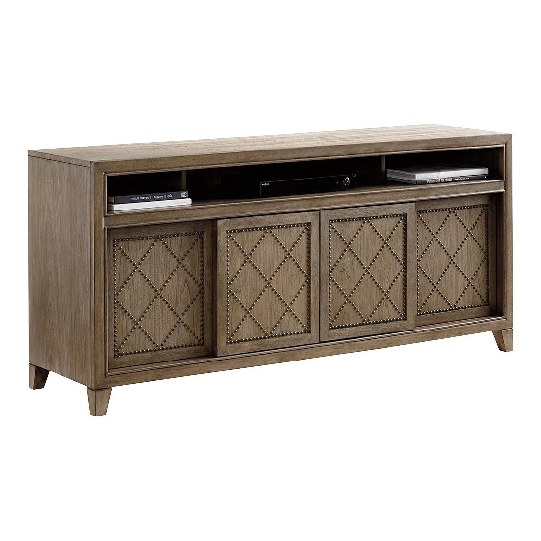 The four sliding doors with a decorative diamond and cross nailhead trim offer the option of showing all doors or two doors paired together in the center or at each end. Each end has two adjustable shelves, and the center section has one adjustable shelf above two drawers for storage. The open area (68W x 8D x 5H) just below the surface has set-back partitions for sound bars, and grommets for wire management.