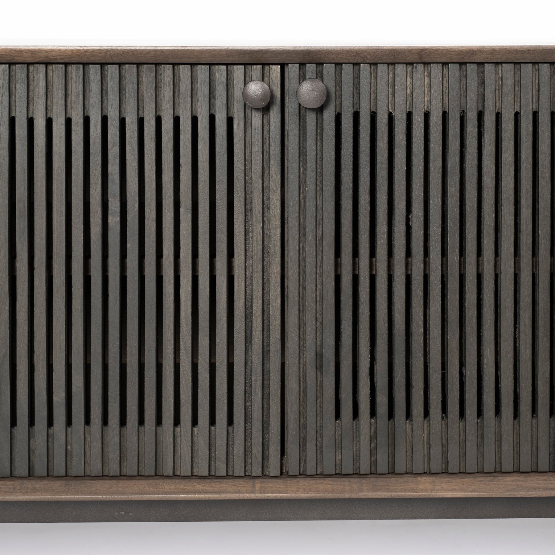 - The four doors on this exquisite media cabinet don an intricate, shutter-inspired pattern that makes it the perfect piece for any modern space.