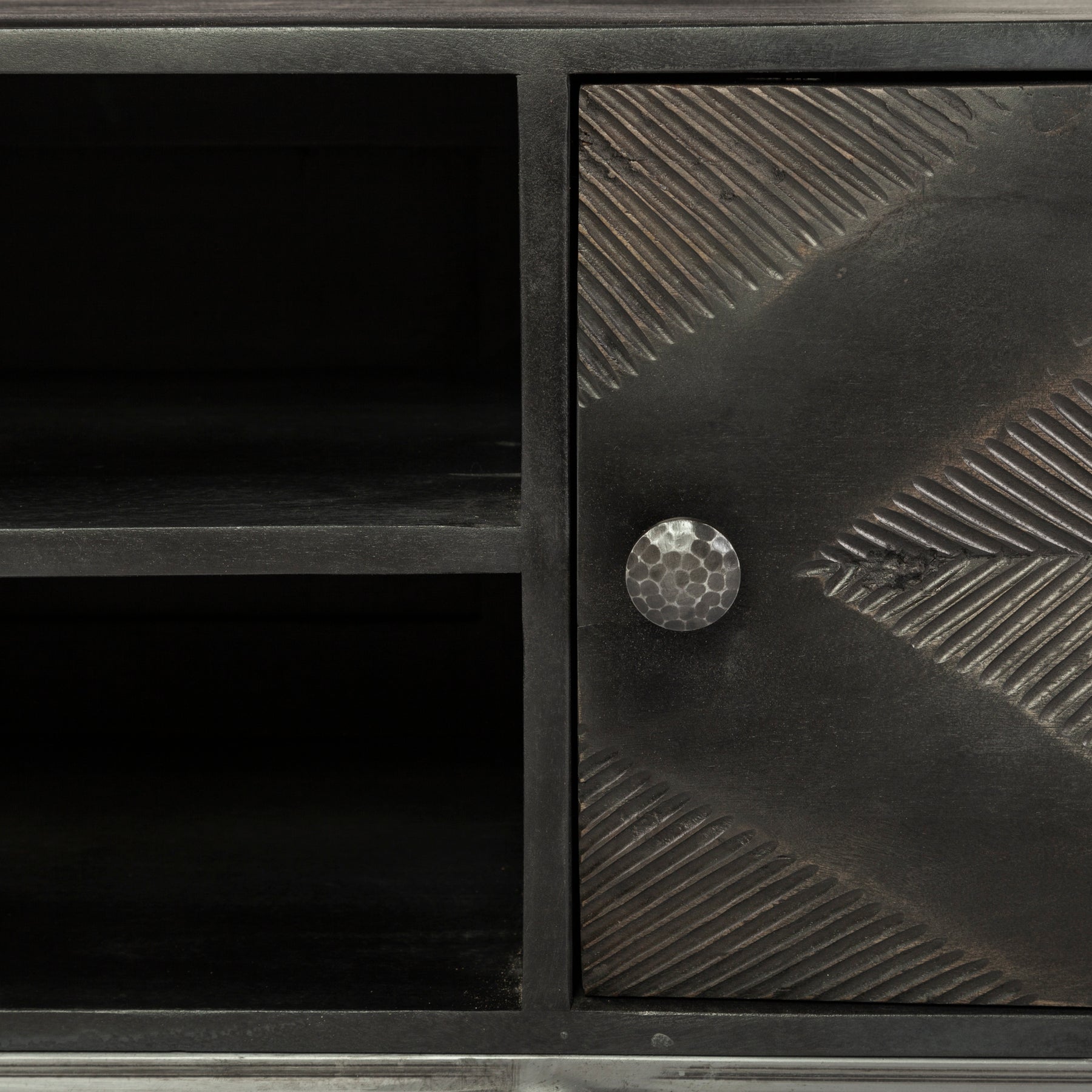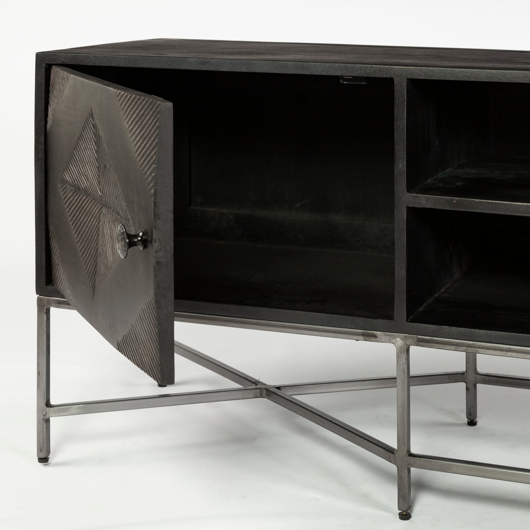Hogarth I is a media console made from Indian mango wood with embossed diamond pattern doors.