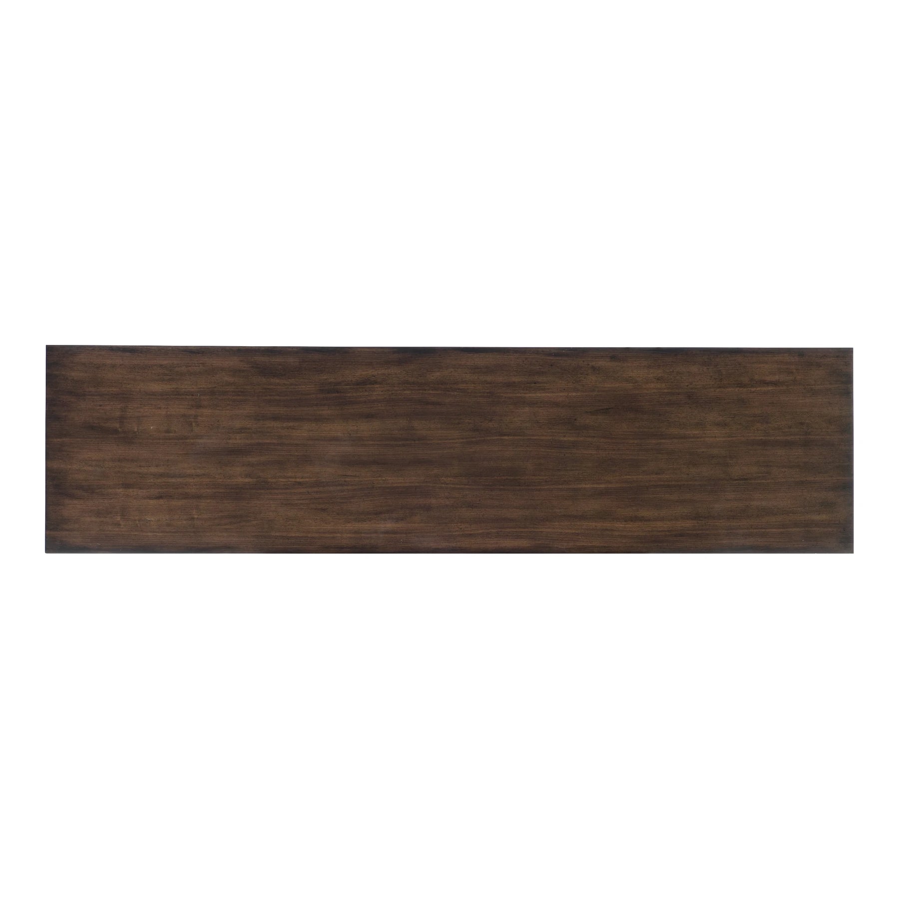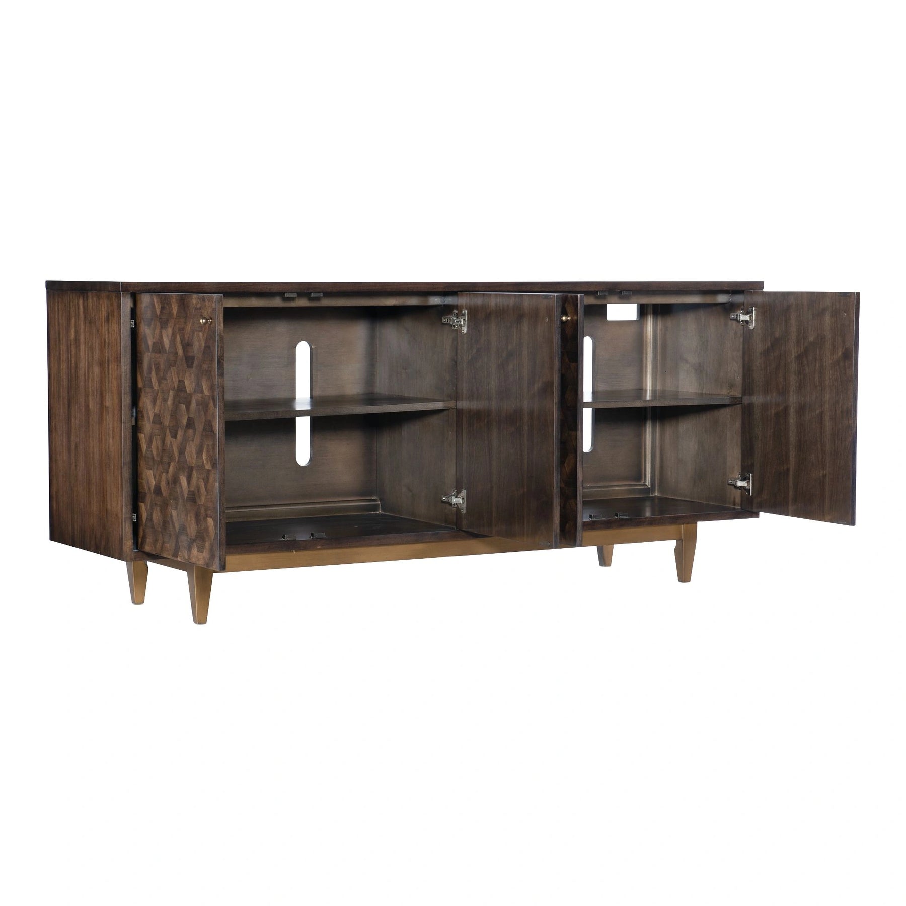 Melange Alpine Four-Door Credenza brings a confident, design-forward feel to your space. Finished in Medium wood finish with gold colored wood base and brass knob hardware. Distressing includes rasping, with a look that complements transitional interiors.
