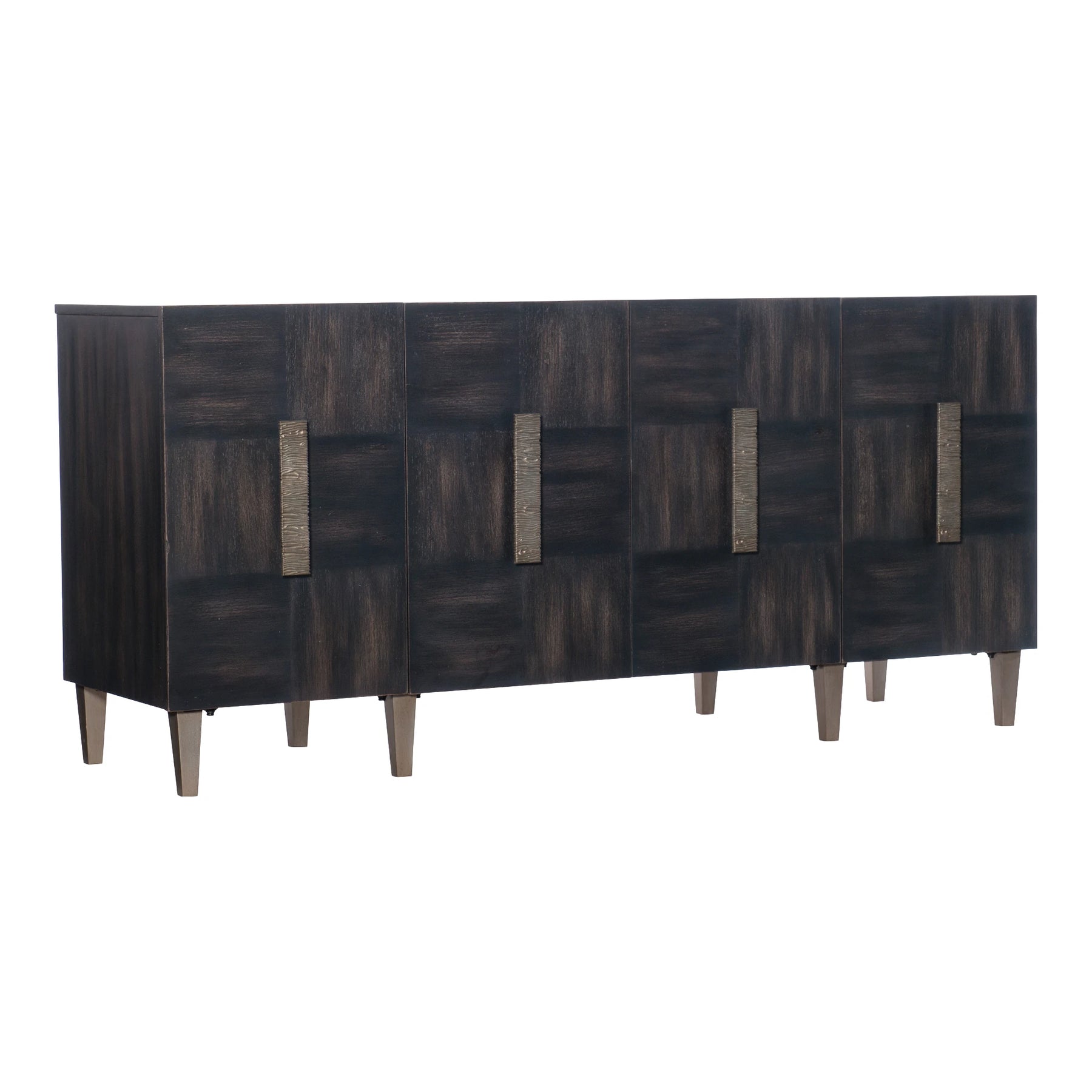Melange Neville Credenza brings a confident, design-forward feel to your space. Finished in Dark walnut finish with textured pewter metal hardware. Distressing includes rasping, chopping and wormholes., with a look that complements transitional interiors.