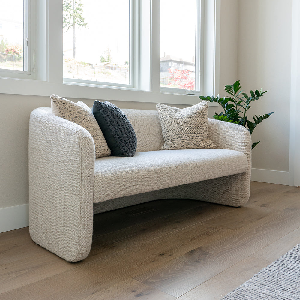 The Eve Settee boasts a tight back and rounded shape with playful curves, perfect for adding a touch of whimsy to any space. Plus, it's customizable for a truly unique piece.