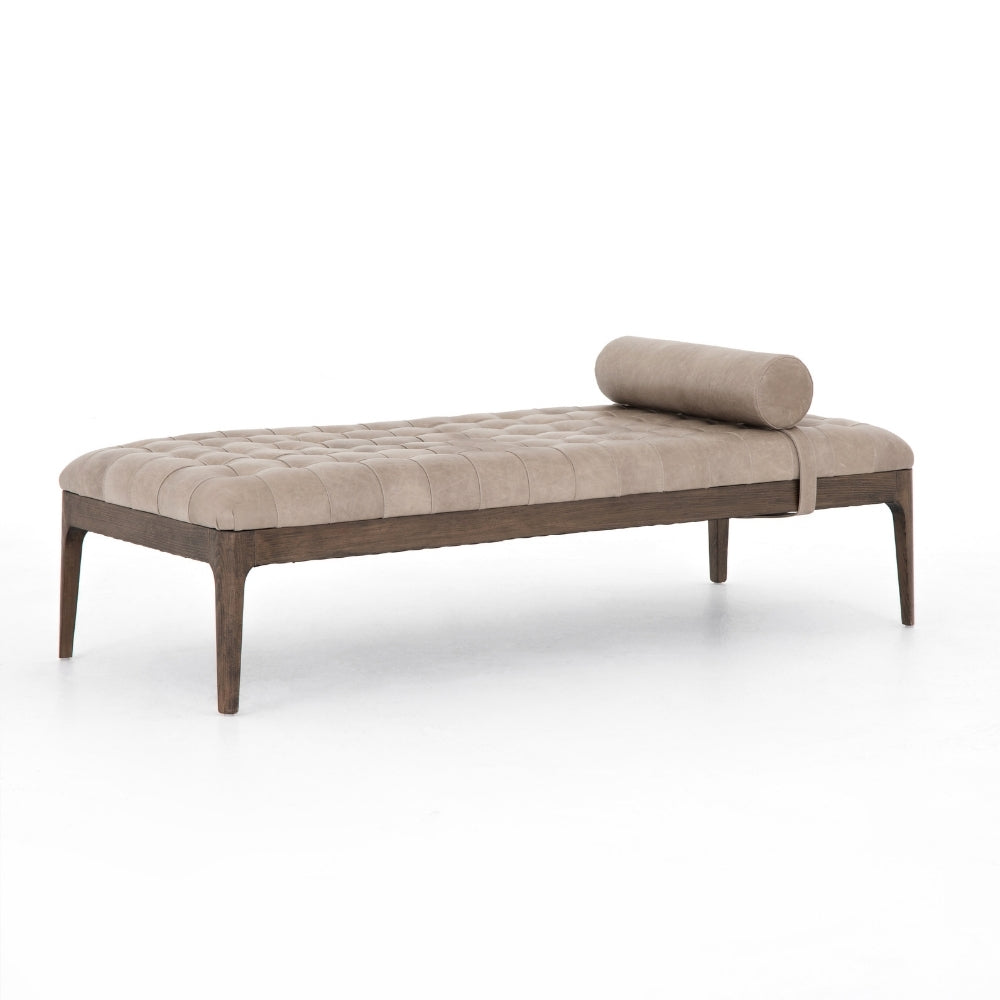 With deep, dramatic tufting and removable bolster pillow, taupe top-grain leather offers a plush place to sit, in an entryway or at the foot of a bed. Moderate seat height at 18.25 in.