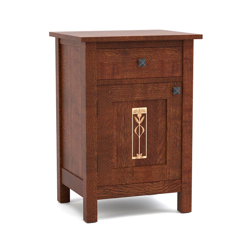Crafted of white oak and inspired by our 2022 Collector Edition, the Meadowflower Nightstand comes in left- and right-hinged versions with one side-hung, center-guided drawer. The door, featuring a stylized modern inlay depicting cornflower and mint, conceals a single adjustable shelf, and a hammered pyramidal knob completes the Mission look.