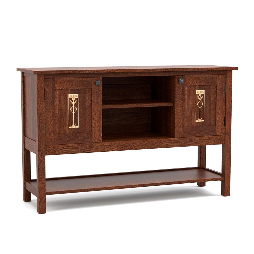 Crafted of white oak and inspired by our 2022 Collector Edition, the Meadowflower Two-Door Sideboard is a spacious dining room piece that also works as a multipurpose console. Two doors at either end, featuring stylized modern inlays depicting cornflower and mint, each conceal a single adjustable shelf. A lower shelf provides additional storage, while hammered pyramidal knobs complete the Mission look.