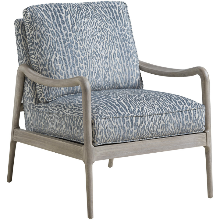 The Leblanc chair is shown in the Shell finish, which complements the Malibu collection's Dune finish. The design is available in custom fabric as shown but also in leather, with your choice of custom wood finishes. Shown here in a blue and cream animal print fabric.- Ultra Down Seat Cushion