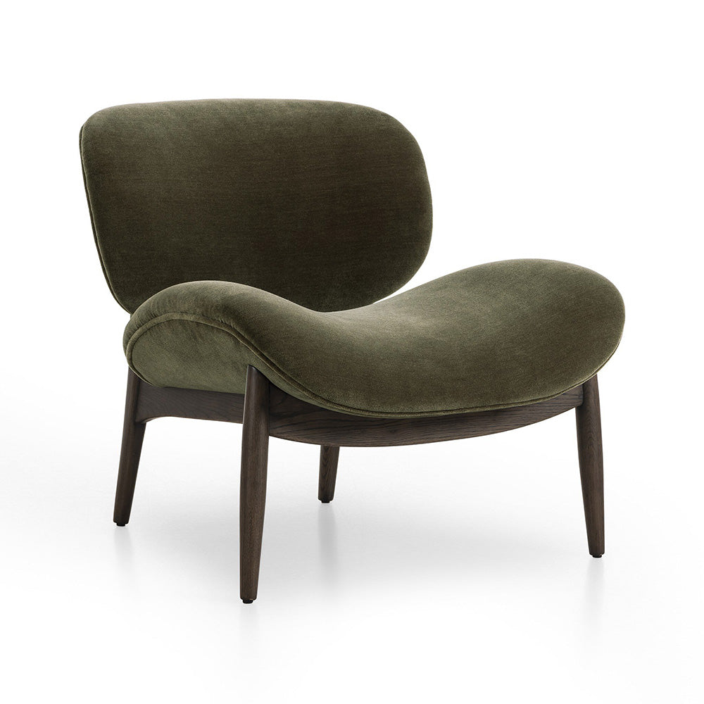 This perfect accent chair, designed for unwinding. Upholstered in a velvety olive chenille made from recycled materials, with wide proportions and cozy curves and cushioning. Slim, tapered wooden legs balance the look.