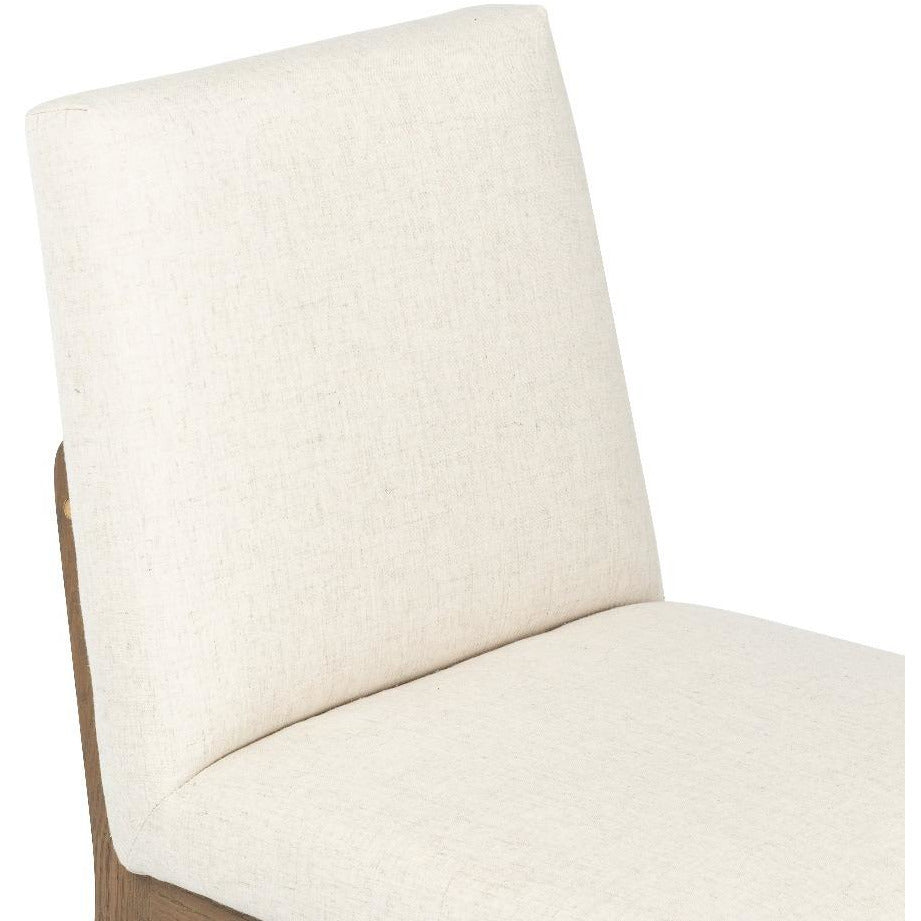 A finely tailored take on dining. Armless honey-colored oak frames performance-grade upholstered seating in an invitingly neutral off white.