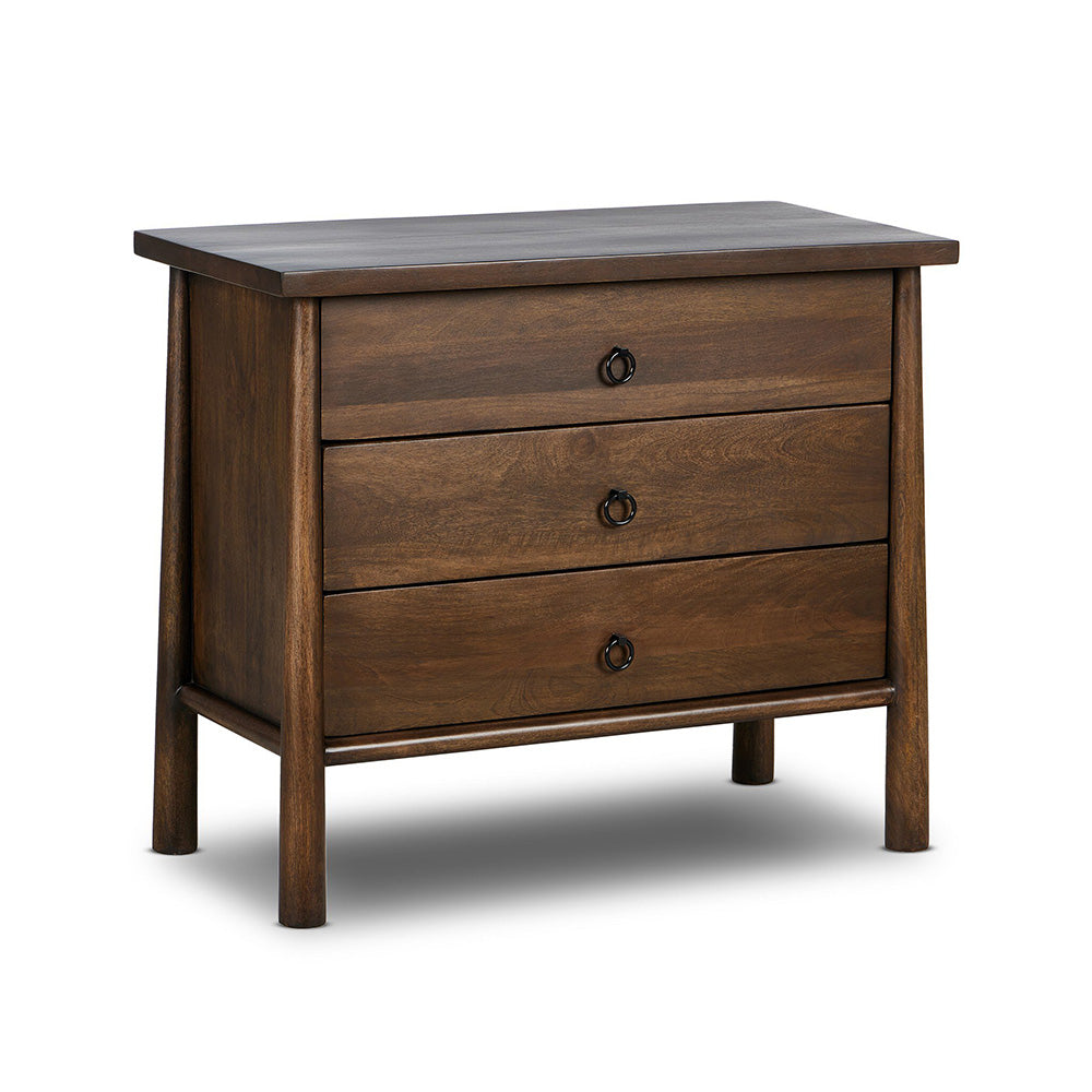 Inspired by French antique design, this dresser stands on round tapered legs with a prominent overhang top. Made of mango wood with cast iron key ring pulls, three drawers make it a versatile choice as a dresser or nightstand.