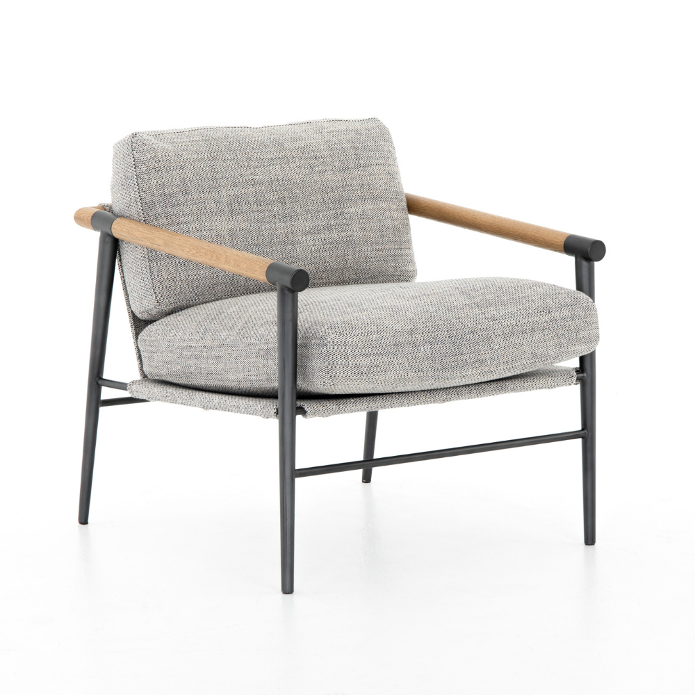 Textural grey seating of performance-grade upholstery, with angular arms of exposed oak providing fresh contrast. Slim, carbon-finished steel legs for a dose of modern-industrial edge.