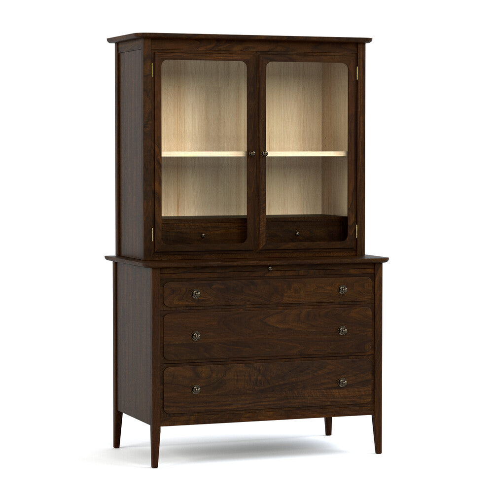 Designed to sit atop the Chest with Pullout Desk, the two-toned Hutch features tall glass doors in radiused walnut frames. Inside, a grooved back and adjustable shelf of Natural Maple provide a bright contrast with the Dark Roast exterior, and two small drawers extend the piece's storage capacity. The doors and drawers share our shaped Iron Gray metal pulls. Shown atop the Chest with Pullout Desk.