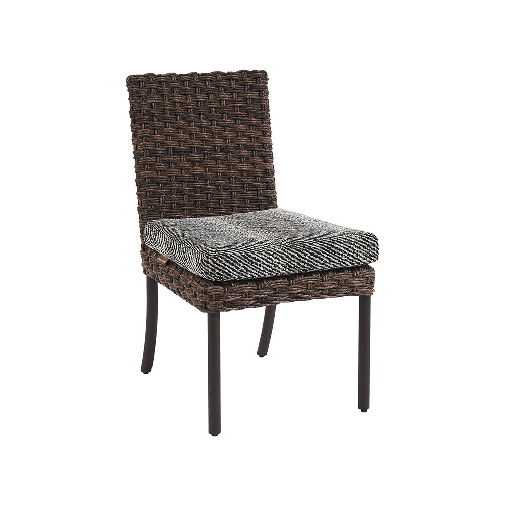 The woven seat and back support a removable seat cushion that is attached to the frame by Velcro straps.