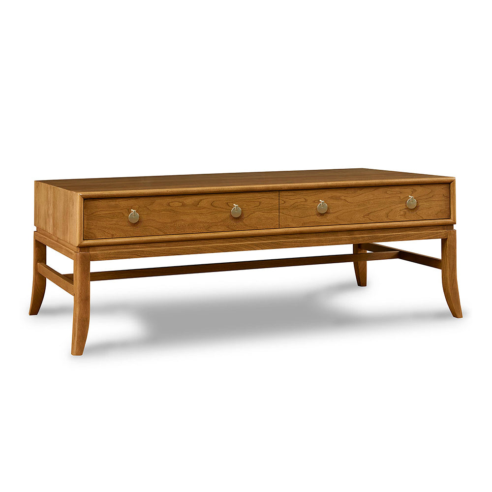 In Martine’s all-cherry occasional group, mitered beading creates a frame around slightly inset drawer faces, and a radiused shape continues down the flared saber legs. The Cocktail Table features two side-hung, center-guided drawers with small pendant pulls. An H-stretcher connects the legs just below the drawers.