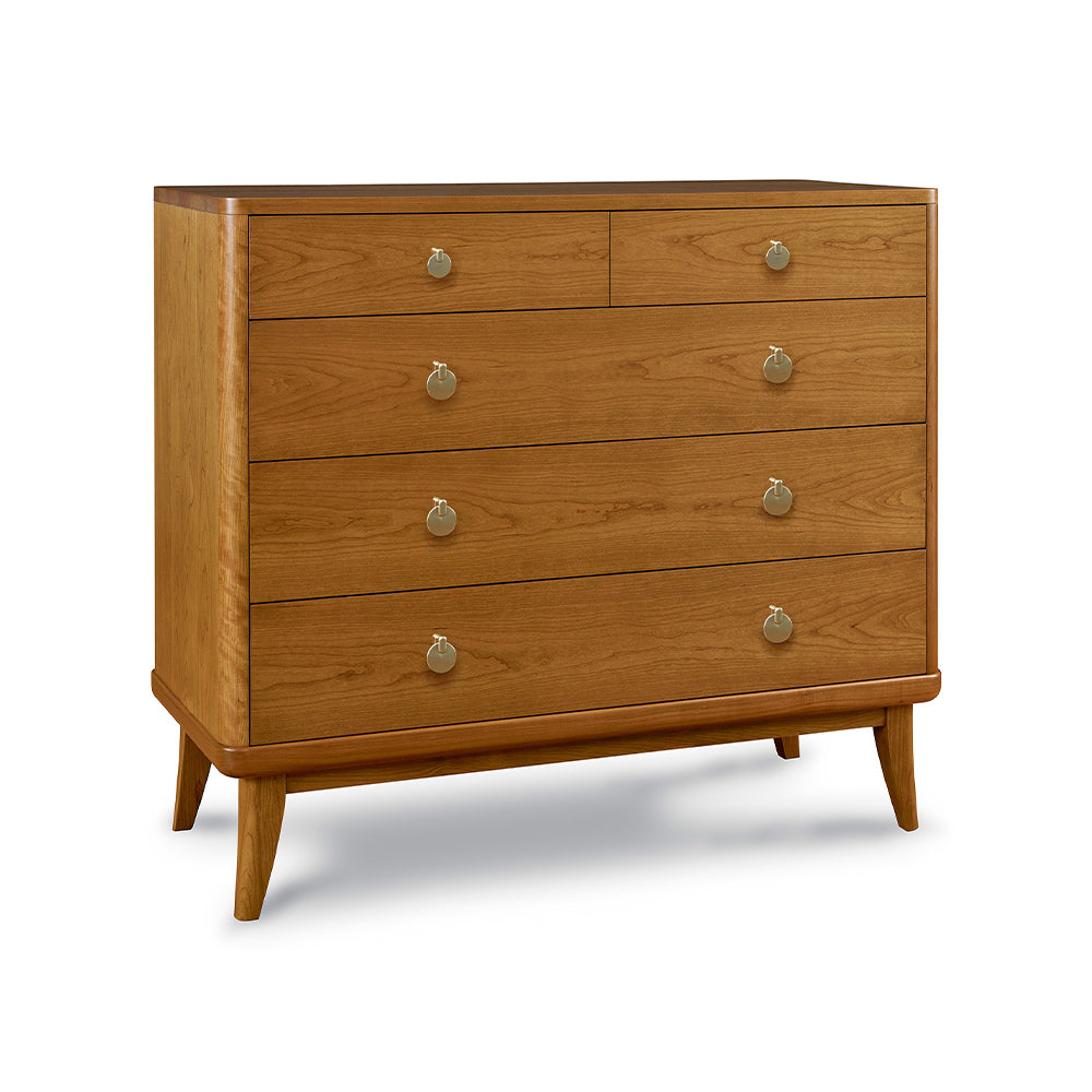 The Martine Low Chest has radiused posts, robust molding, saber legs, and our Brushed Bronze pendant pulls, custom-designed for the Martine Collection. Storage consists of three wide side-hung, center-guided drawers and two narrow ones, with continuous-match cherry veneers creating a flowing, open grain. A lined jewelry tray sits in the top-right drawer.
