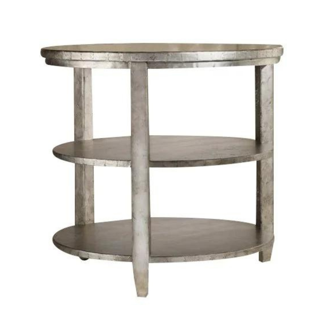 The aluminum sheet-covered Maverick Table adds a shimmer of silver and an element of character to any spot in your home.- Two Shelves