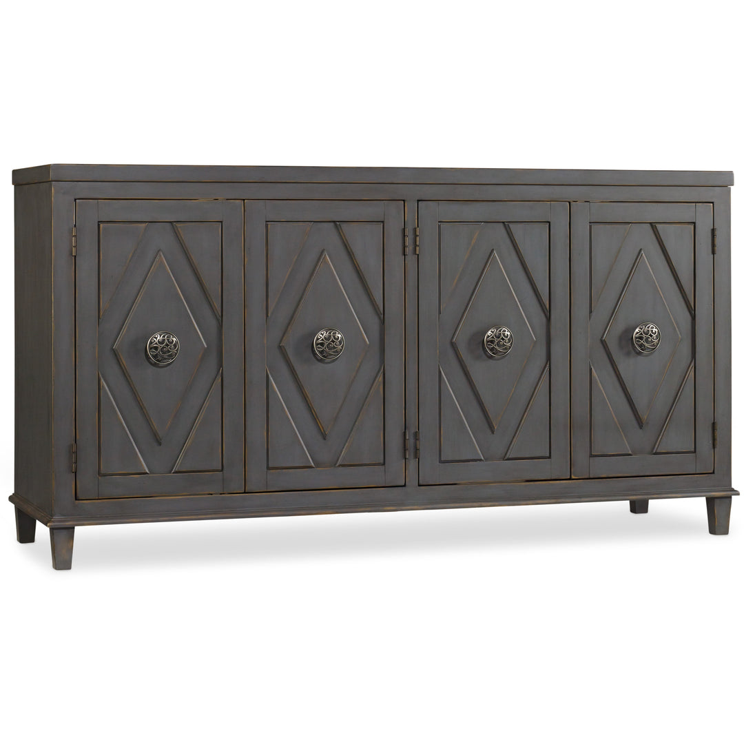 The Melange Raellen Console has a muted gray finish with storage behind the doors and can also be used as an entertainment console.