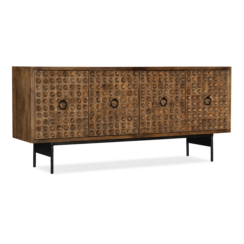 With the look of hand-forged craftsmanship, the 4-door Swanston Credenza is constructed of Mango Wood with a black metal base and black metal circular hardware pulls. Accommodating up to a 65-inch TV, the credenza has 4 doors with soft-close hinges, one fixed shelf behind each pair of doors, and a ventilated back panel.