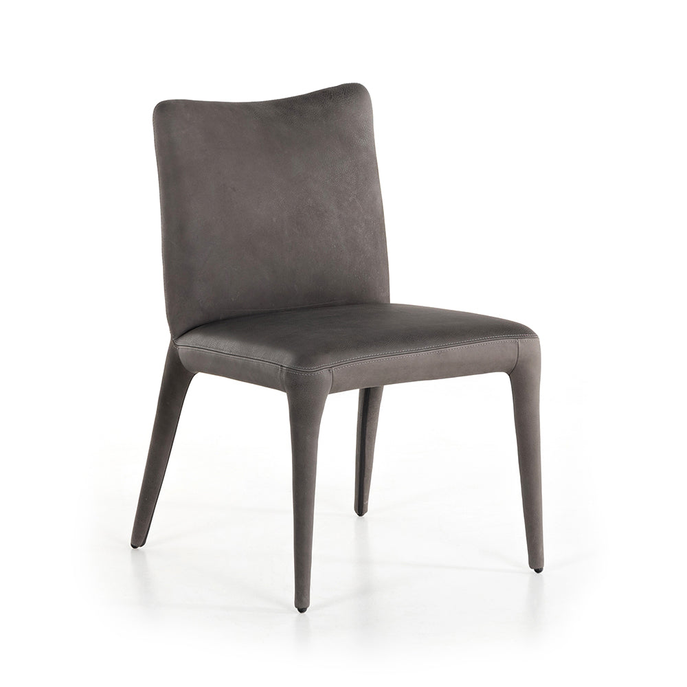 Shapely and sleek, with a scooped back and tapered legs, graphite top-grain leather brings total sophistication to the dining table.