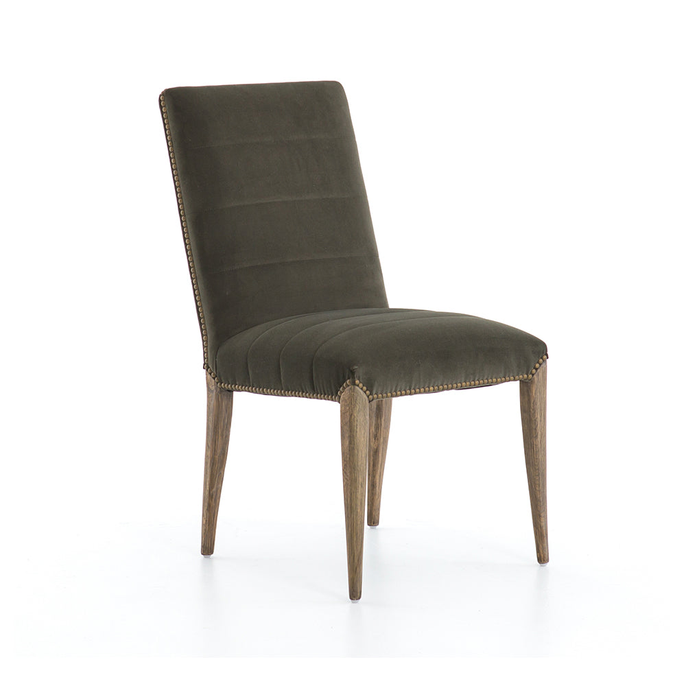 Clean mid-century shaping is updated via channeled, velvet-like seating in a greyish sage. Tapered oak legs and hand-applied brass nailhead trim add fresh edge.