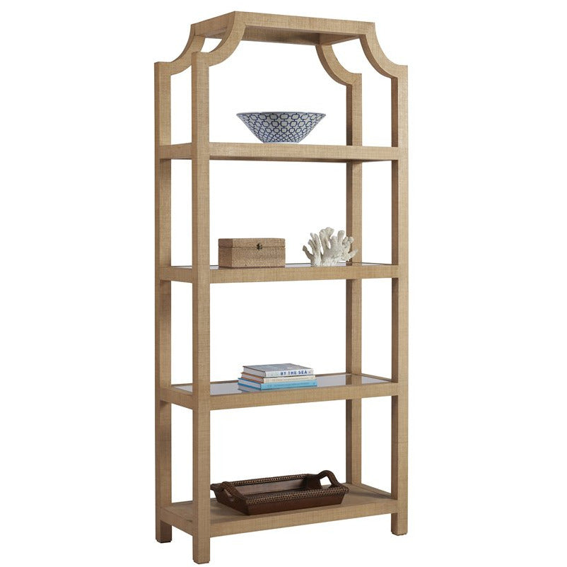 - Entirely clad in raffia, the Beachcomber étagère offers a remarkable look as a single unit or in pairs. The design features a stationary shelf at the base, three ultra-clear tempered glass inset shelves in the middle and a glass insert in the top of the crown