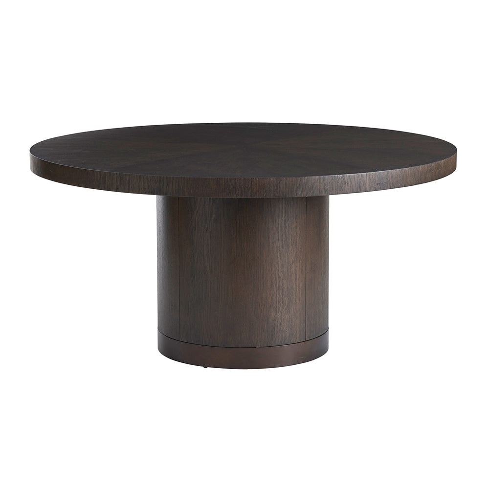 The pedestal table features a top of radial matched white oak in the dark mocha Canyon finish and a decorative metal frame on the base in the burnished bronze finish.