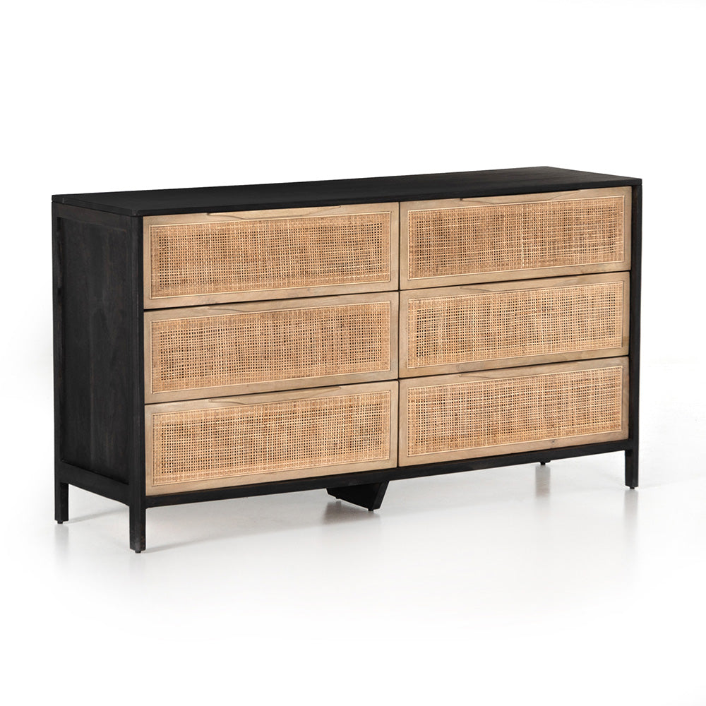 Black-washed mango encases six spacious drawers of woven cane, for a textural look with eye-catching contrast.