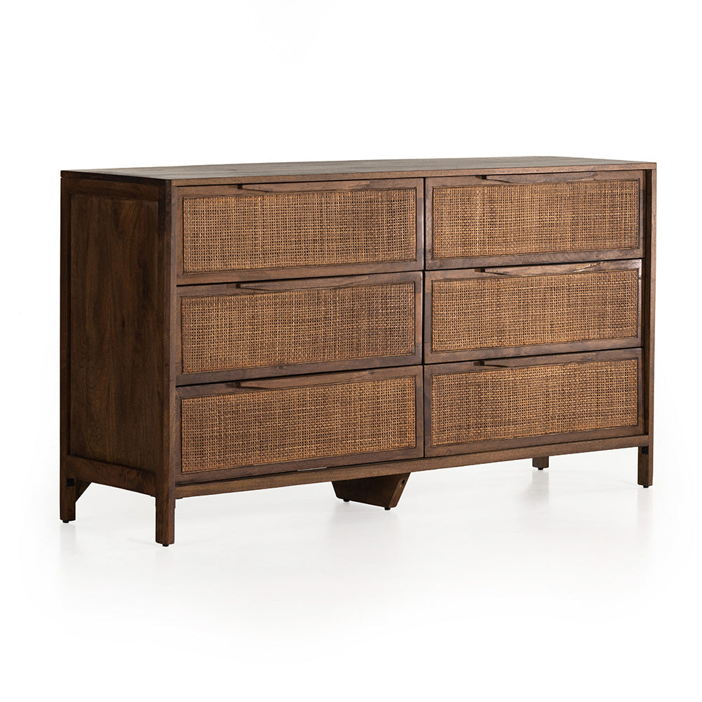 Brown-washed mango encases six spacious drawers of woven cane, for a textural look with monochromatic vibes.