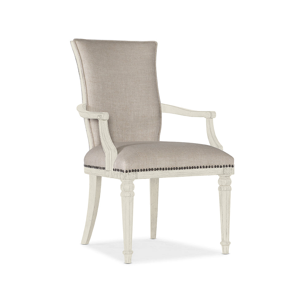 Inspired by European antiques and architecture, the Traditions Arm Chair has classic carved French legs and a calming monochromatic color palette pairing the soft white Magnolia finish with the Biscuit performance fabric cover in 100% linen on the upholstered seat and back. Nailhead trim around the seat and back and a wood handle at the top of the back add delightful details.
