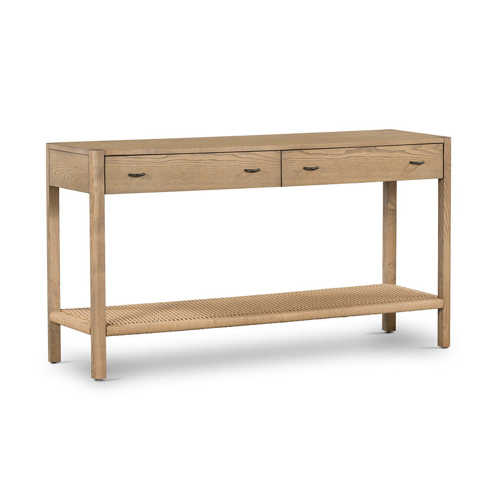A Danish-inspired design celebrates simple, refined shaping. Made from solid ash with dual drawers, open shelving of woven paper cord further ups storage and display options.